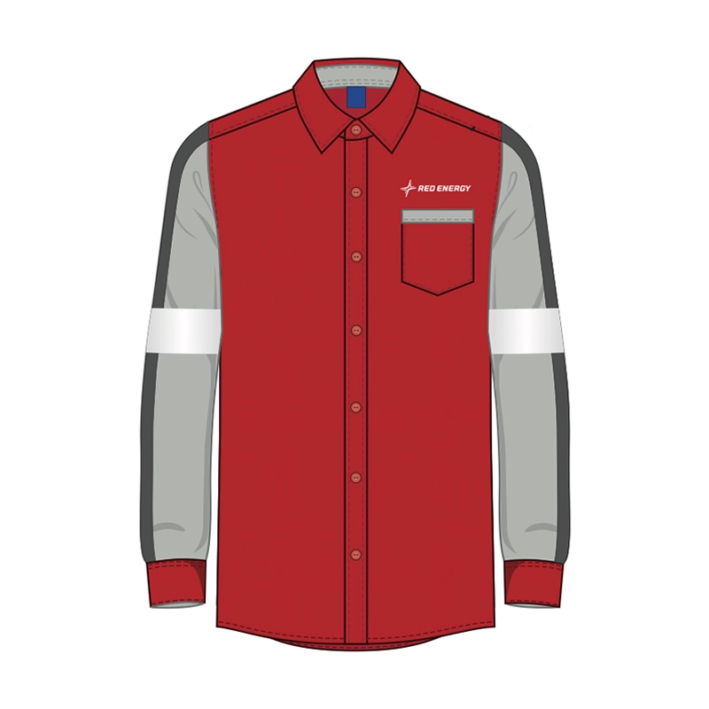 Bordado RED ENERGY blanco en delantero izquierdo de 9 cm y en espalda de 24 cm. 7 Botones ahumados en aletilla y 2 para puños, No.24.
